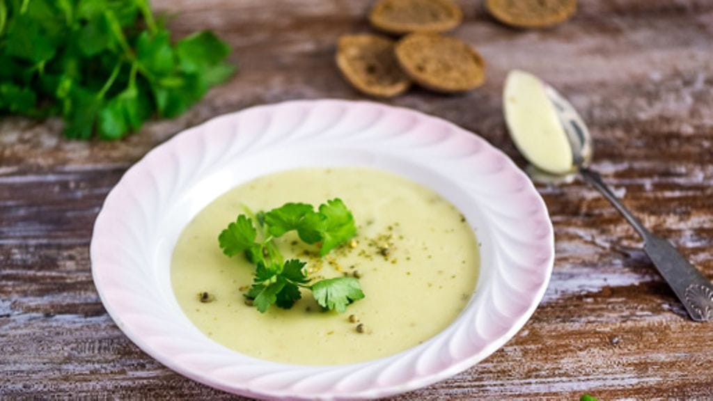 Lisää kerma, keitinlientä tarpeen mukaan ja rouhi joukkoon viherpippureita.