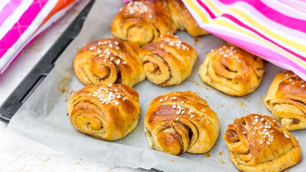 Kääri tangoksi. Jaa tanko yhtä suuriin osiin ja litistä palat keskeltä korvapuusteiksi. Nosta korvapuustit leivinpaperilla vuoratulle uunipellillä ja kohota liinan alla lämpimässä paikassa.