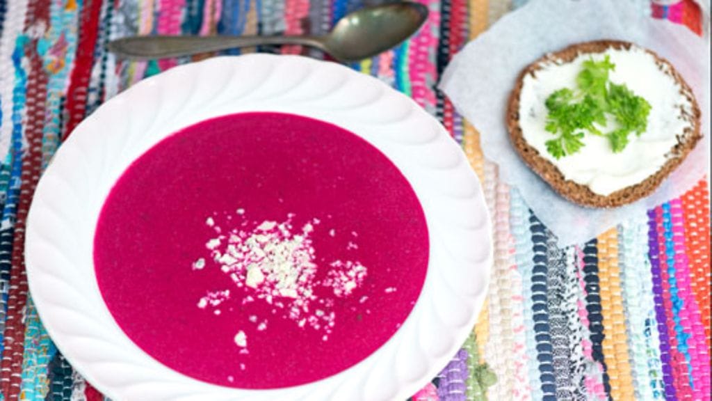 Siivilöi perunoiden keitinvesi talteen ja liuota joukkoon kasvisliemikuutio. Soseuta perunat ja punajuuret samaan aikaan esimerkiksi sauvasekoittimella tai tehosekoittimessa.