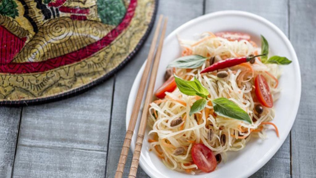 Koristele salaatti paahdetuilla maapähkinöillä tai suolapähkinöillä ja thai-basilikalla.