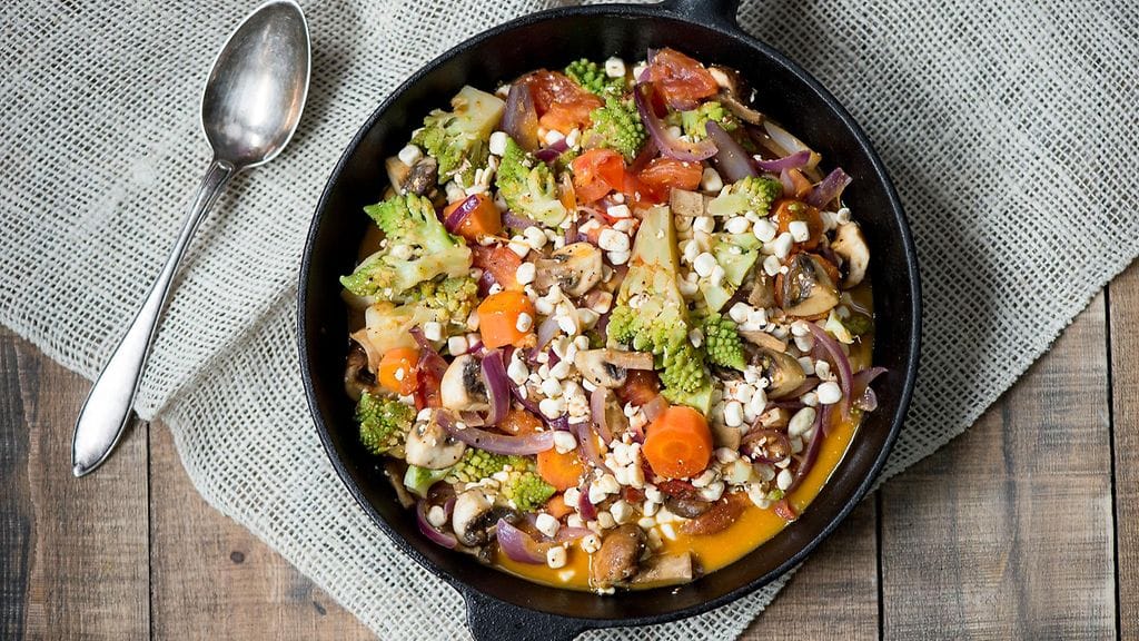 Paloittele romanescokaali, tomaatit ja herkkusienet.