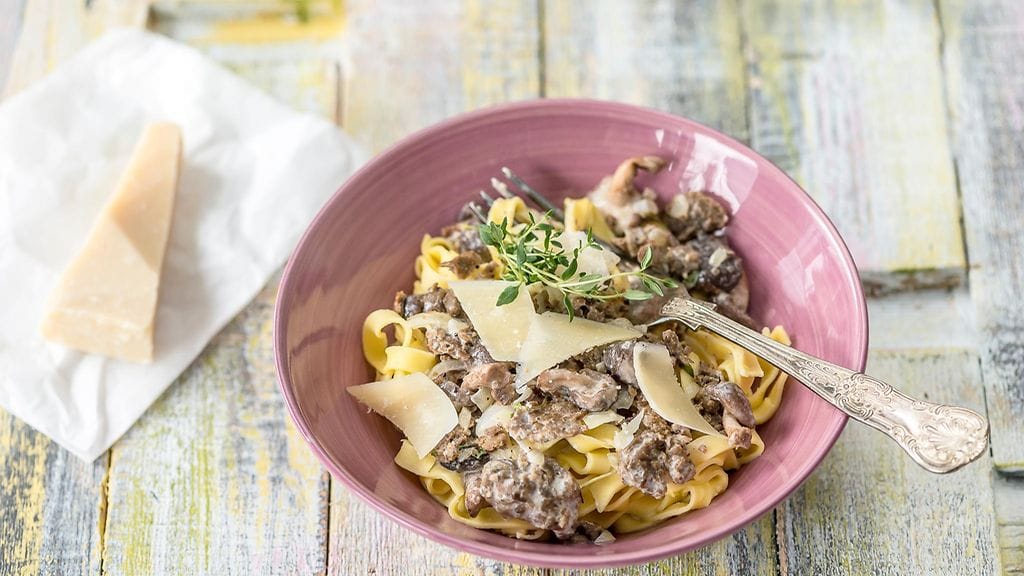 Nauti pasta Härkis-kermakastikkeen kanssa ja tarjoa seuraksi parmesaanilastuja.