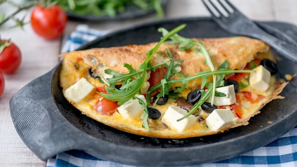 Ripottele loppuvaiheessa pinnalle fetajuustopaloja ja viipaloituja oliiveja. Valuta hyytynyt munakas lautaselle ja koristele rucolalla.