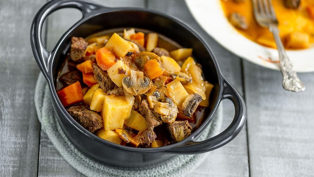 Leikkaa naudanliha reiluiksi suupaloiksi. Kuori bataatti, porkkanat, juuripersilja ja sipuli. Leikkaa ne kuutioiksi. Viipaloi herkkusienet.