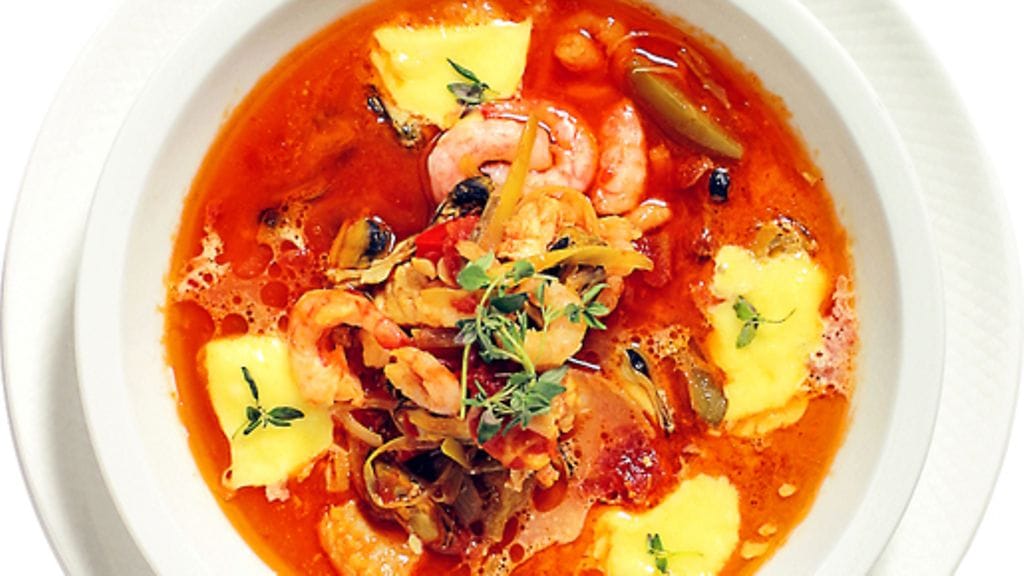 3. Lisää kala ja anna kiehua vielä 5 minuuttia. Lisää kerma ja äyriäiset, mausta suolalla ja pippurilla.