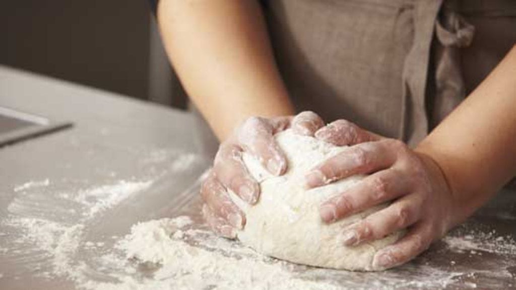 2. Sekoita suola ja jauhot keskenään. Lisää seos taikinanesteeseen vähän kerrallaan, ja alusta taikinaksi. Jos aiot vaivata taikinan käsin, on ranteessa oltava ruista! Vaivaa viisi minuuttia koneella tai 10 minuuttia käsin. Taikinan tulee olla melkoisen kiinteää. Peitä kulho ja anna taikinan kohota vedottomassa paikassa tunnin ajan.