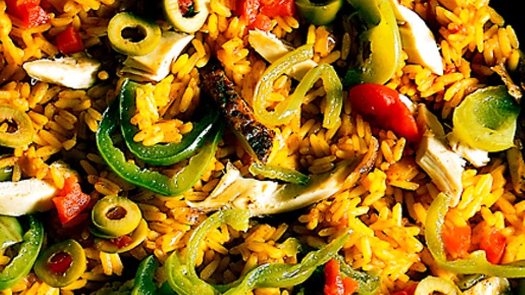 3. Irrota broilereista lihat ja kuutioi pieneksi. Kuullota paprikasuikaleet pehmeiksi öljyssä, lisää kanaliemi ja sen jälkeen lihapalat. Kuumenna. Sekoita paprikat ja broilerinlihat riisin joukkoon ja sirottele pinnalle viipaloidut oliivit.