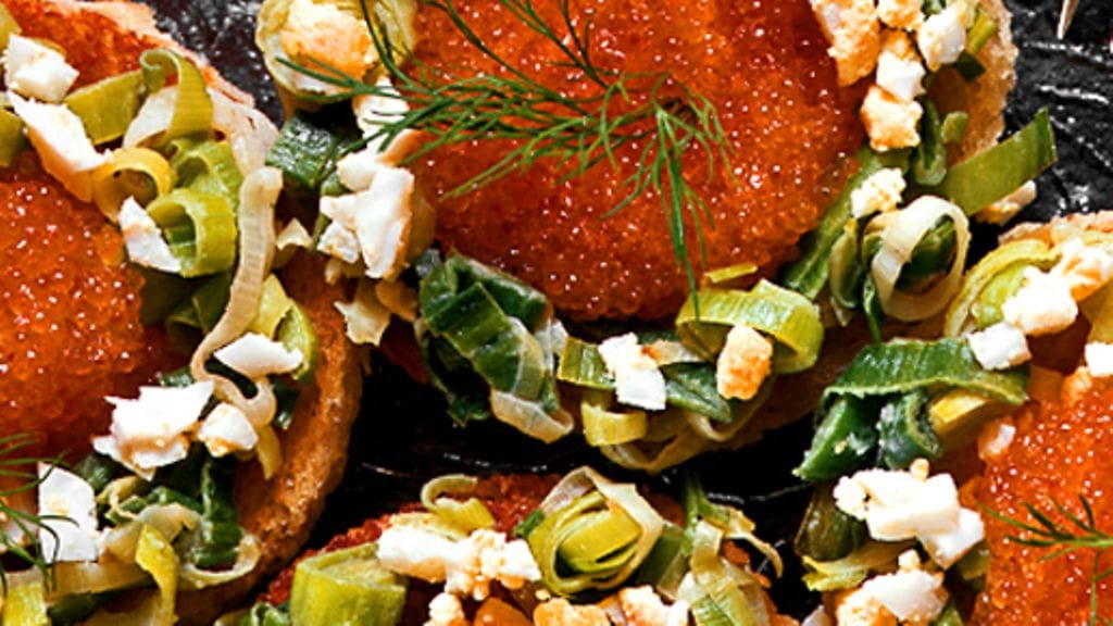 2. Viipaloi purjo hienosti ja paista. Hienonna kananmuna. Laita leiville nokareet siianmätiä, asettele mädin ympärille purjoa ja munasilppua. Koristele tillillä.