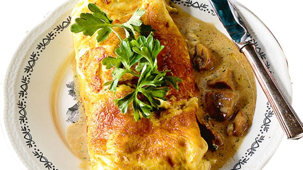 3. Ravista pannua ja liikuttele ja nostele seosta (puu)haarukalla, kunnes munakas alkaa hyytyä. Ota pannu toiseen käteen ja lyö toisella kädellä napakasti muutaman kerran pannun kahvaan samalla hieman kallistaen pannua. Huomaat omeletin liukuvan irti pohjasta. Kaada nyt muhennos munakkaalle ja taita se kahtia tai kääräise rullalle. Liu’uta varovasti tarjoiluvadille, joka on esilämmitetty. Sirottele päälle persiljasilppua. Tarjoile heti.