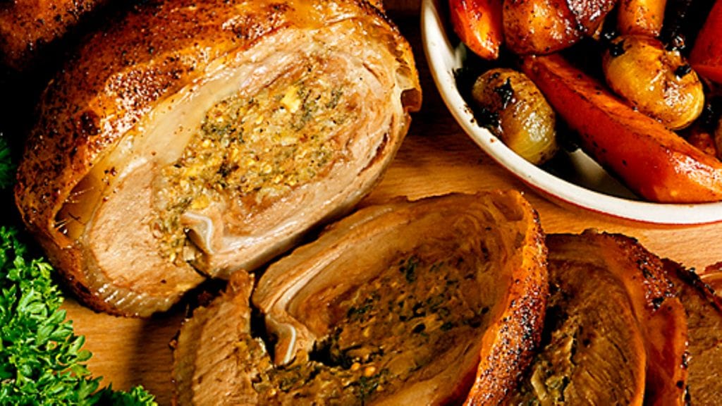 2. Aseta rulla uunipannulle ja juurekset sekä sipulit ympärille. Paista kypsäksi uunin keskitasolla noin 1,5 tuntia. Anna käärön levätä uunista otettuna 10 minuuttia.