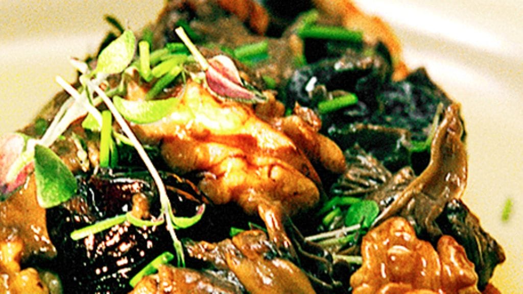 2. Kaada paistettu seos tehosekoittimeen tai vastaavaan mikseriin ja pyöritä sileäksi kastikkeeksi. Kaada kastike kasariin ja pidä lämpimänä. Kuivaa paistinpannu, kuumenna loppu öljy kuumaksi, lisää tattien hattupalat sekä kantarellit ja kuullota 5 minuuttia. Lisää sitten pannulle silputtua timjamia (säästä hieman koristeeksi) sekä luumut ja keitä vielä 2-3 minuuttia. Lisää saksanpähkinät.