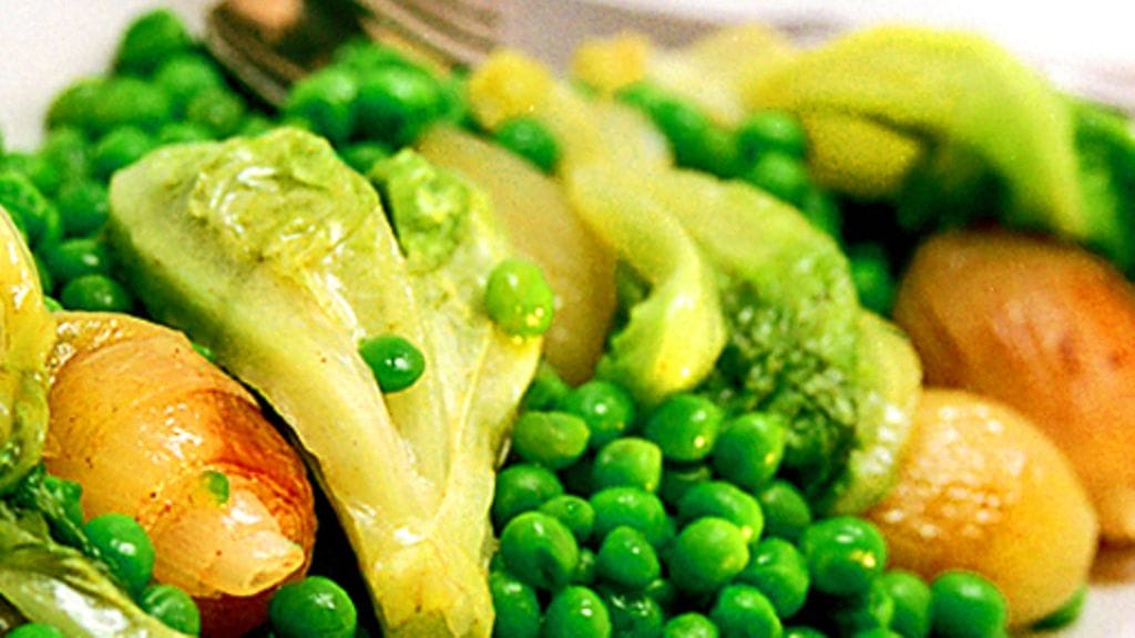 3. Laita salaatti sipulikattilaan, lisää herneet ja keitä kaikkea kannen alla vielä 10 minuuttia. Leikkaa pois puuvillalangat ja poista persiljanoksat. Sekoita vielä kerran, mausta ja tarjoile.
