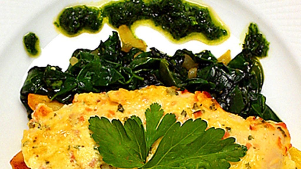3. Huuhtele pinaatinlehdet hyvin ja leikkaa tai revi ne isohkoiksi paloiksi. Hienonna sipuli ja freesaa voissa ruskistamatta. Lisää pinaatit ja freesaa hetken aikaa. Mausta suolalla ja pippurilla ja raasta päälle vähän muskottia. Sekoita. Tarjoile broilerifileet lohkoperunoiden ja pinaatin kanssa.