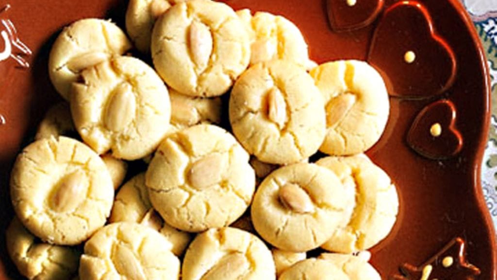 3. Pyörittele taikina pitkoiksi, jaa ne paloiksi ja kääri niistä pieniä, pyöreitä pikkuleipiä, jotka laitat leivinpaperille pellille. Paina jokaisen päälle puolikas manteli. Paista uunissa n. 10 minuuttia.