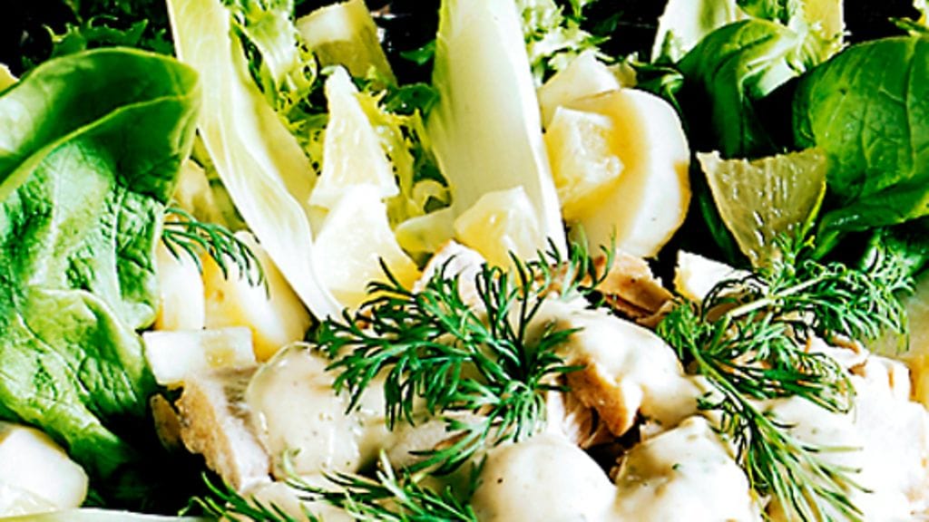 3. Asettele salaatinlehdet kauniisti vadille ja broileripalat, greippikuutiot ja perunanpuolikkaat päälle. Tipauttele broileripalojoen päälle nokareet kastiketta ja koristele tillillä. Tarjoile loput kastikkeesta erillään. Vaalea, rapea leipä on hyvää lisäksi.