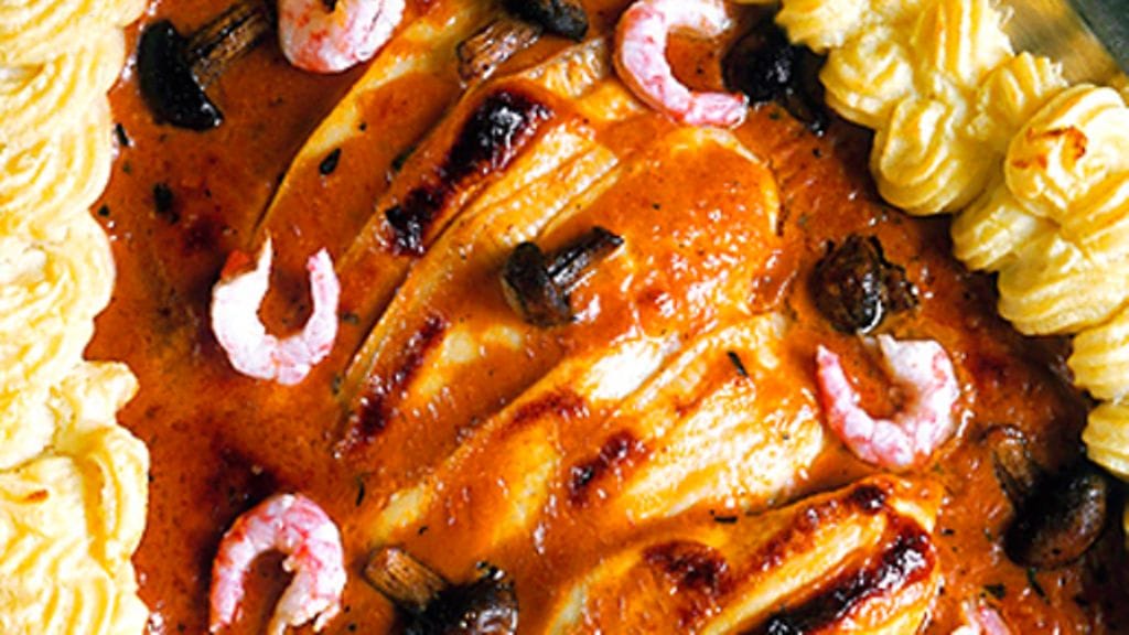 5. Kuumenna uunin lämpötila 275 asteeseen. Sekoita perunamuusi ja keltuainen sekä juustoraaste, pursota vadin reunoille. Ripottele päälle sienet ja gratinoi kunnes ruoka on kauniin värinen. Ripottele päälle katkaravut.