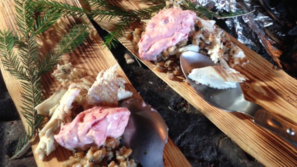 Keitä ohraryynit, väljässä kevyesti suolatussa vedessä, noin puolisen tuntia. Valuta ja huuhtele kylmällä vedellä. Leikkaa sipuli ohuiksi renkaiksi, samoin purjo. Kuullota sipulit runsaassa voissa ja lisää tillisilppu. Lisää joukkoon ohraryynit, nokkospesto ja sekoita hyvin. Myllytä hieman pippuria joukkoon. Tämä kaikki kannattaa tehdä kotona ennen kalaan lähtemistä.
