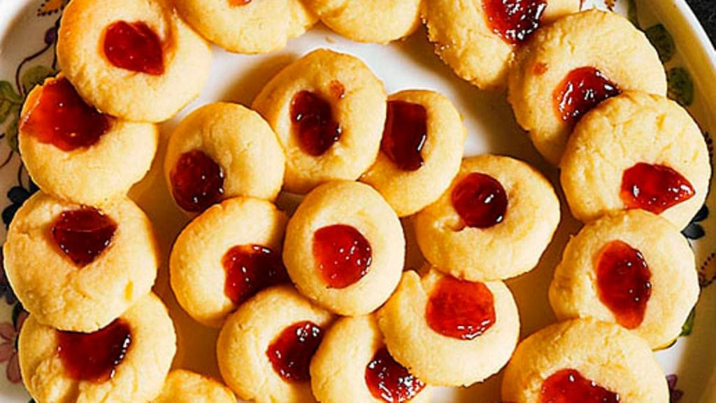 4. Paina jokaiseen pikkuleipään syvennys ja laita siihen hyytelöä. Paista uunin keskitasolla 8-10 minuuttia.