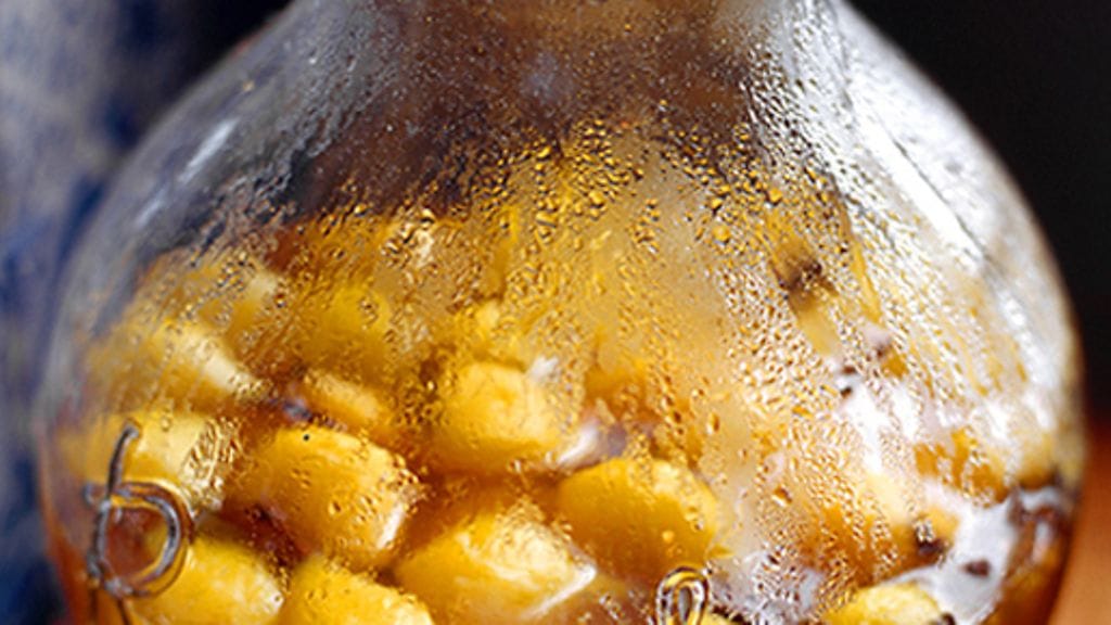 3. Laita päärynät huolellisesti puhdistettuun, kuumaan purkkiin, kaada liemi päälle ja sulje purkki. Kun purkki on jäähtynyt, laita se jääkaappiin maustumaan. Tarjoile päärynät kevyesti vatkatun kerman kera.