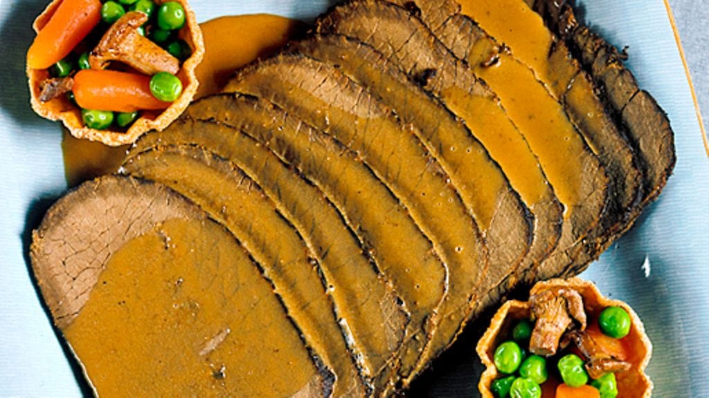 3. Nosta liha padasta. Siivilöi liemi kastikekasariin, lisää kerma ja kiehauta. Suurusta veteen sekoitetulla jauholla. Keitä jauho kypsäksi 5 minuuttia. Mausta kastike pihlajanmarjahyytelöllä.