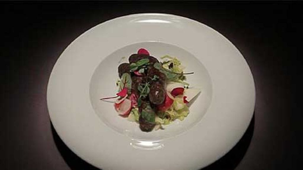 Leikkaa kasvikset pieniksi (sopivan kokoisiksi). Lämmitä voi, valkoviinietikka, valkoviini, tryffeli ja tryffeliöljy pannussa. Lisää kasvikset ja hieman vettä. Kypsennä varovasti ja mausta lopuksi suolalla.