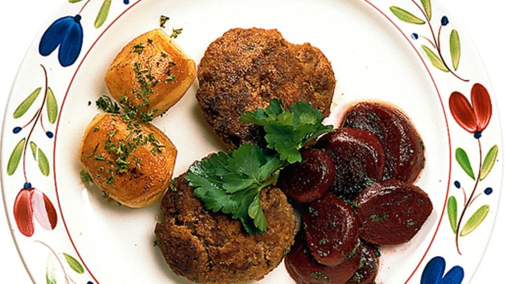 3. Muotoile taikinasta 8 pihviä. Paista voissa 3-4 minuuttia molemmin puolin. Sulata 1 rkl voita kattilassa, lisää keitetyt punajuuriviipaleet ja paista kevyesti pari minuuttia. Mausta suolalla ja pippurilla, lisää ruohosipuli. Paista keitetyt perunat voissa.