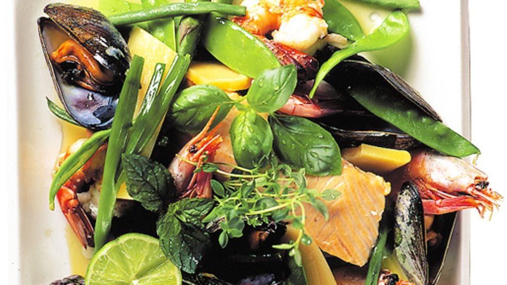 2. Pane höyrykeitin päälle. Varmista, että vesi kiehuu kunnolla. Pane kala, jättikatkaravut ja mahdollinen parsa keittimeen. Lisää 3 minuutin kuluttua simpukat, katkaravut kuorineen sekä loput vihannekset. Anna kypsyä höyryssä vielä 5 minuutin ajan, kunnes simpukat ovat avautuneet kunnolla. Sulata kypsymisen aikana voi.