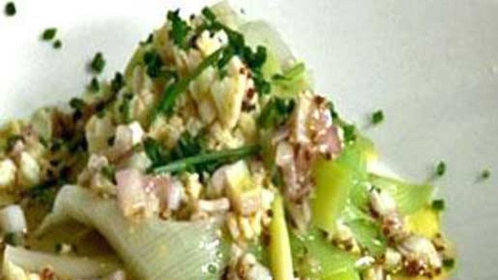 Asettele halkaistut purjot lautasille, lisää päälle munaa ja vinegrettiä.