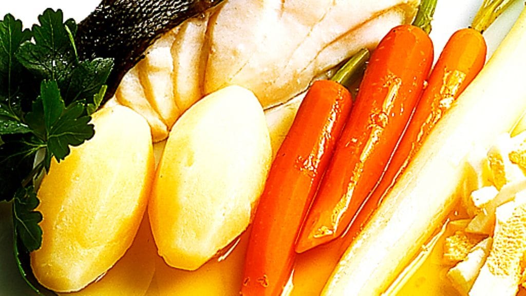 4. Pane lautanen ylösalaisin kattilan pohjalle ja aseta turskapalat lautasen päälle. Lisää tilkka vettä ja höyrytä kala kypsäksi. Pidä kansi suljettuna, mutta varmista, ettei vesi kiehu liian voimakkaasti. Kala valmistuu 8-10 minuutissa. Höyrykypsennyksen tulee olla riittävän hellävaraista, jotta aromit eivät häviä. Tarjoa heti persiljan, porkkanoiden ja munavoin kera.