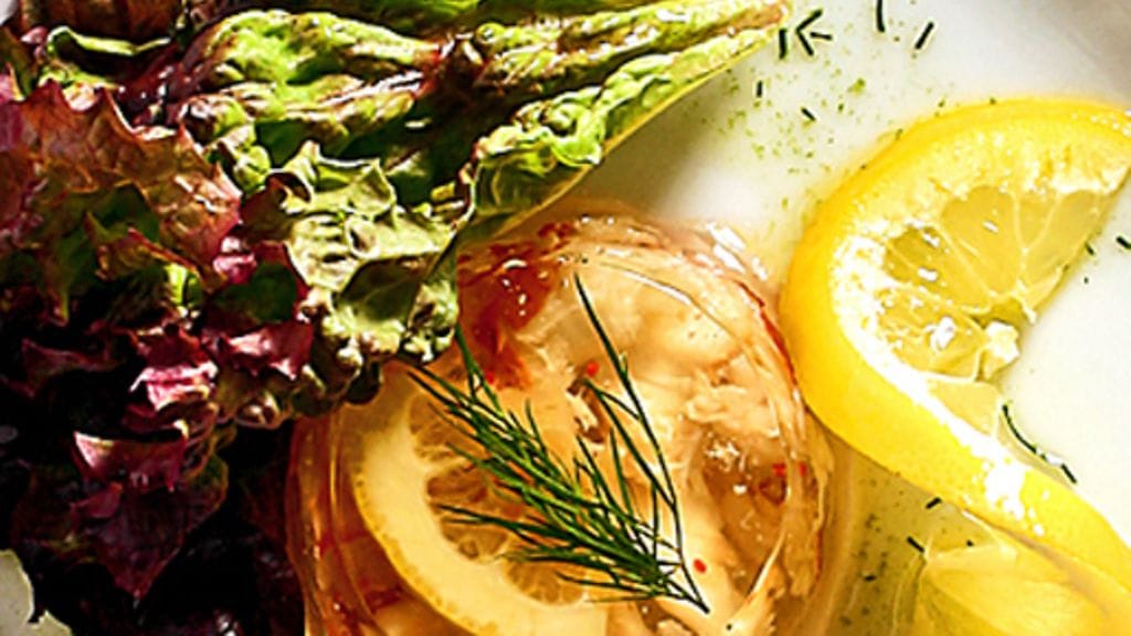 3. Kumoa hyytelöt lautasille, joilla on salaatinlehtiä. Koristele kaunis rapuleivos mädillä ja tillillä.