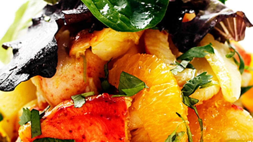 2. Appelsiinifondi: Purista appelsiineista mehu. Kuori ja silppua sipuli. Murskaa ja paloittele sitruunaruoho. Kuullota sipulia, currya ja sitruunaruohoa kattilassa öljyssä ruskistamatta. Lisää paahdetut hummerinkuoret ja kaada päälle appelsiinimehu, porkkana- ja limettimehu. Kaada päälle sen verran vettä, että kuoret peittyvät, kuumenna kiehuvaksi ja anna poreilla hiljaa 20 minuuttia. Ota kattila liedeltä ja anna fondin vetäytyä 30 minuuttia. Siivilöi fondi puhtaaseen kattilaan ja kuumenna kiehuvaksi. Keitä kokoon ilman kantta, kunnes 2 dl on jäljellä. Jäähdytä fondi jääkaapissa.