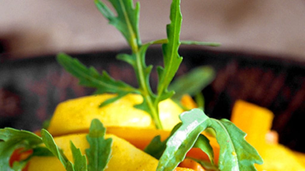 3. Lisää hunaja, mausta suolalla ja pippurilla. Ripottele viimeiseksi päälle rucolaa.