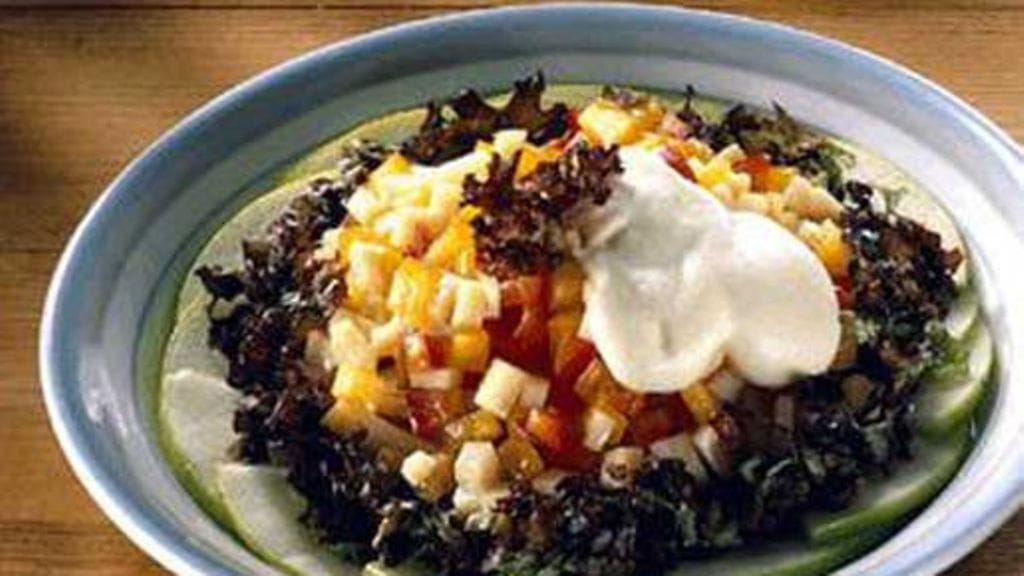 Sekoita kastike salaatin joukkoon. Asettele salaatti lautasille salaatinlehtien päälle.