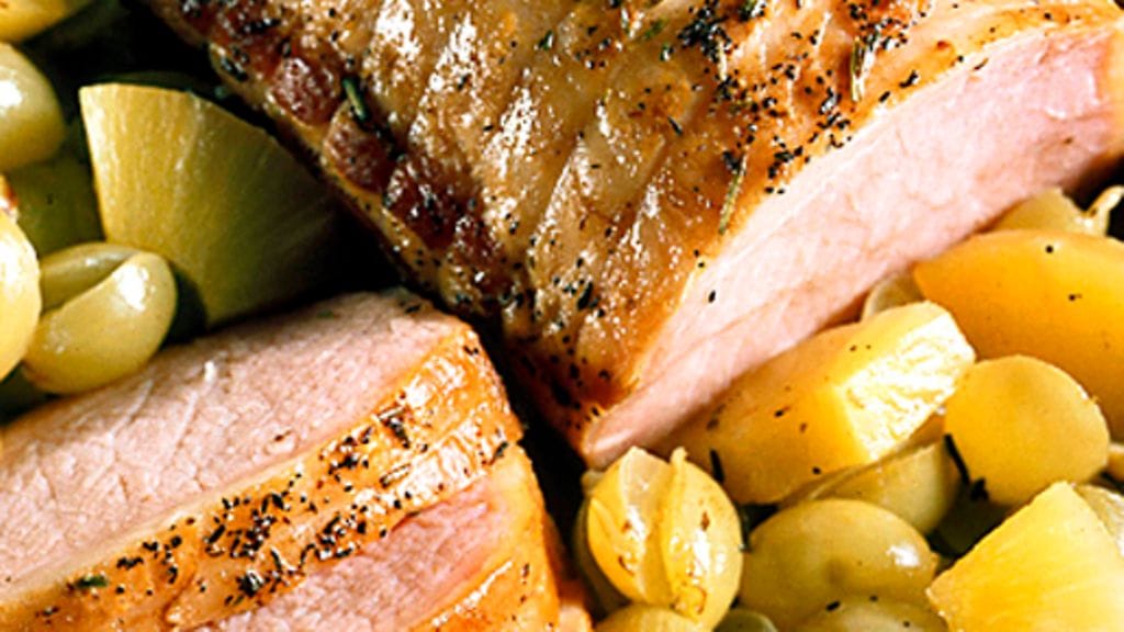 1. Laita kasler uunivuokaan valutettujen ananaspalojen ja halkaistujen viinirypäleiden kera.
