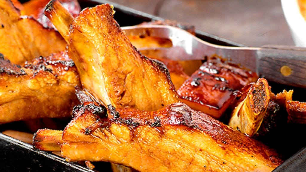 3. Paista kääntämisen jälkeen vielä noin 20 minuuttia ja kaada sitten pannulta pois rasva (älä viemäriin!). Levitä hunaja kyljen lihaisalle puolelle ja karamellisoi uunissa noin 10 minuuttia, valele pari kertaa.