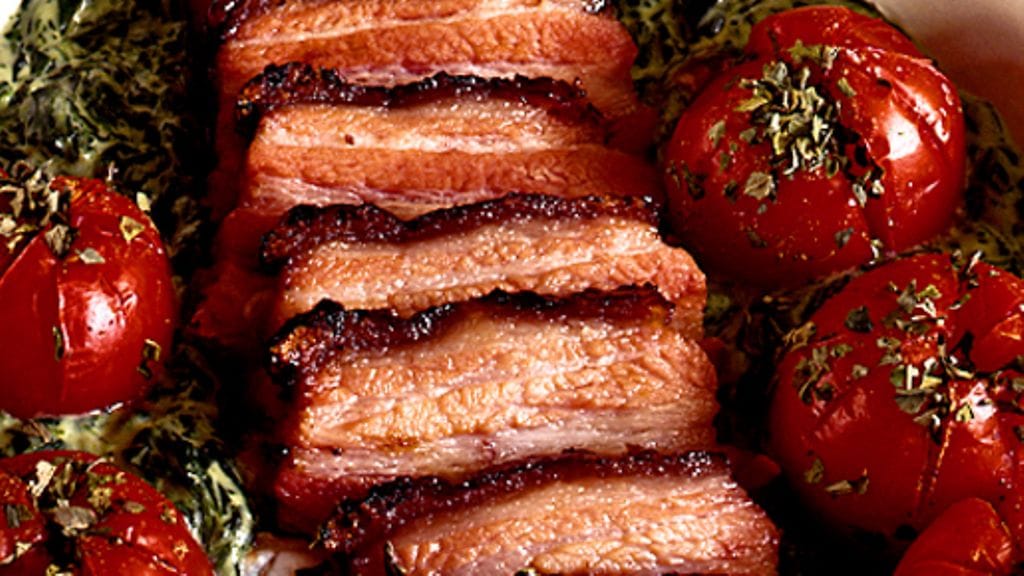 5. Sulata pinaatti ja tarjoile viipaloitu sianliha pinaattipedillä tomaattien kera.