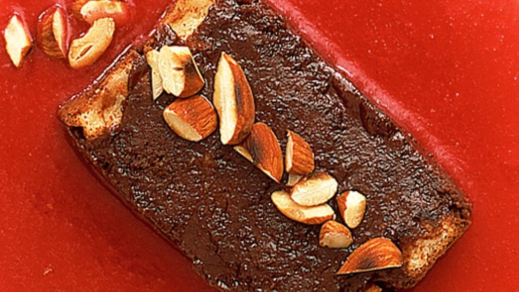2. Mittaa suklaa, voi ja hunaja kulhoon ja sulata vesihauteessa erittäin matalassa lämpötilassa (enintään 36 astetta). Sekoita tasaiseksi ja anna jäähtyä hieman. Erottele keltuaiset ja valkuaiset. Vatkaa valkuaiset kovaksi vaahdoksi ja vatkaa keltuaisia, kunnes seos hieman vaalenee. Sekoita suklaamassa keltuaisvaahtoon ja kääntele varovasti joukkoon valkuaisvaahto. Vuoraa kakkuvuoka tuorekelmulla. Pane vuoan pohjalle toinen mantelipohja, leikkaa tarvittaessa reunoja. Kaada päälle suklaamassa ja peitä toisella mantelipohjalla. Peitä vuoka tuorekelmulla ja anna olla jääkaapissa vähintään 3 tuntia, mieluiten yön yli.