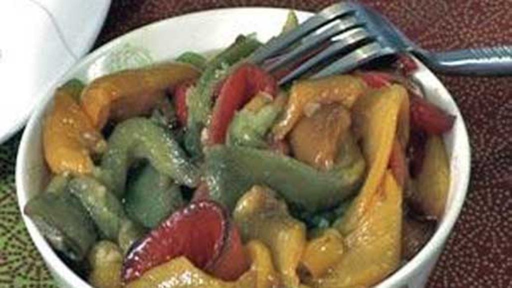 Leikkaa kuoritut paprikat pitkittäin suikaleiksi ja laita suolan kanssa kulhoon. Murskaa paprikoiden sekaan valkosipulinkynnet ja lorauta sekaan n. ½ dl valkoviinietikkaa sekä saman verran oliiviöljyä. Pyöräytä huvipuistosalaattia pari kertaa ympäri, tarkista maku ja laita jääkaappiin odottamaan seuraavaa päivää. Huvipuistosalaatti maistuu parhaiten jääkaapissa maustuneena.