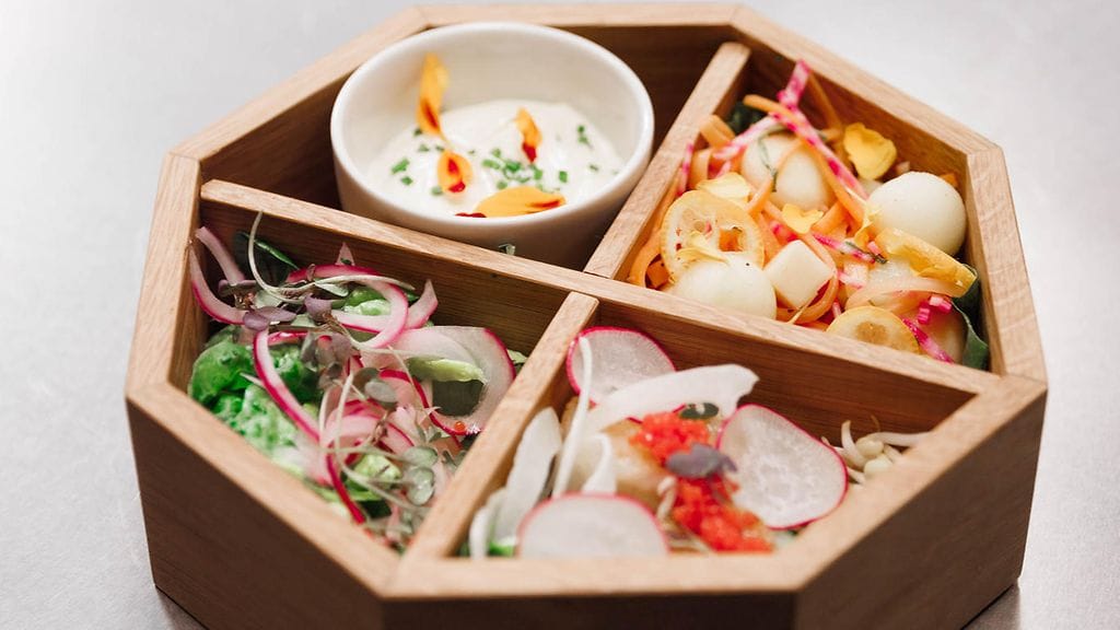 Leikkaa porkkanat ja raitajuuret julienneksi ja pyöräytä palloraudalla omenasta palloja.