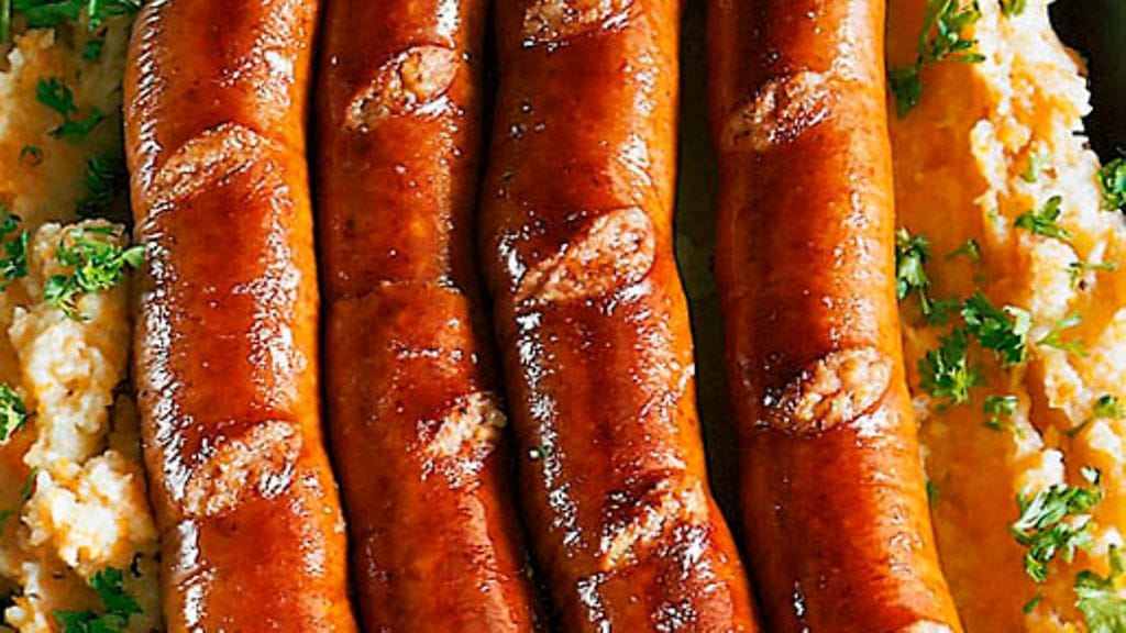 2. Purista juurekset perunapuristimella tai survo ne käsin. Lisää hieman keitinlientä ja vatkaa sose kuohkeaksi. Mausta voinokareella, suolalla ja pippurilla. Laita muusi uunivuokaan. Aseta makkarat, joihin olet tehnyt viiltoja, muusin päälle ja pane uuniin noin 15 minuutiksi. Tarjoile sinapin kanssa.