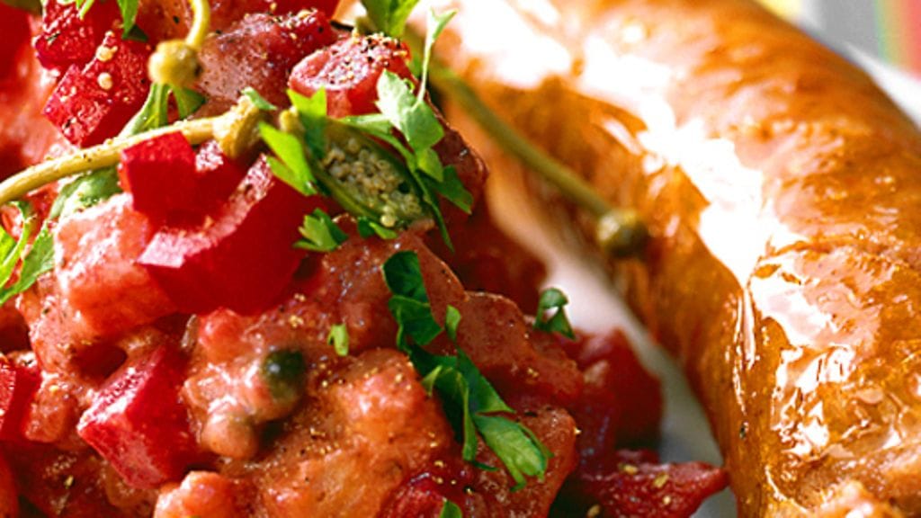 3. Juuri ennen tarjoilua sekoita keskenään punajuuret, kaprikset sekä sinappi ja kääntele seos perunamuhennokseen, lisää suolaa ja pippuria tarvittaessa. Tarjoile paistettujen makkaroiden kanssa.