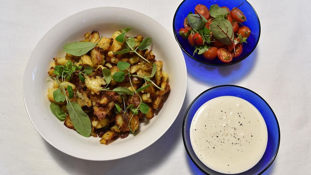 Höyrytä perunoita höyrytin kattilassa. Litistä perunat pellille, mutta älä tee muhennosta. Pyörittele perunat hennosti ja lisää perunoiden päälle öljy ja mausta reilulla sormisuolalla.
