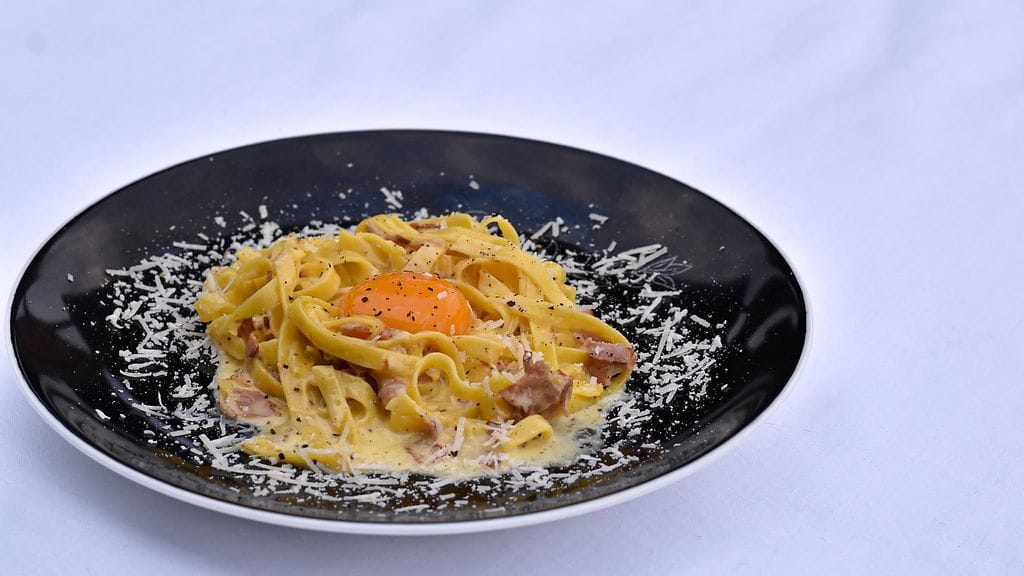 Keitä pasta suola vedessä, jossa liraus rypsiöljyä. Kun pasta kypsä lisää ne kastikkeen joukkoon kananmunan keltuisten kanssa ja sekoita kastike. Tarkista lopussa maku.