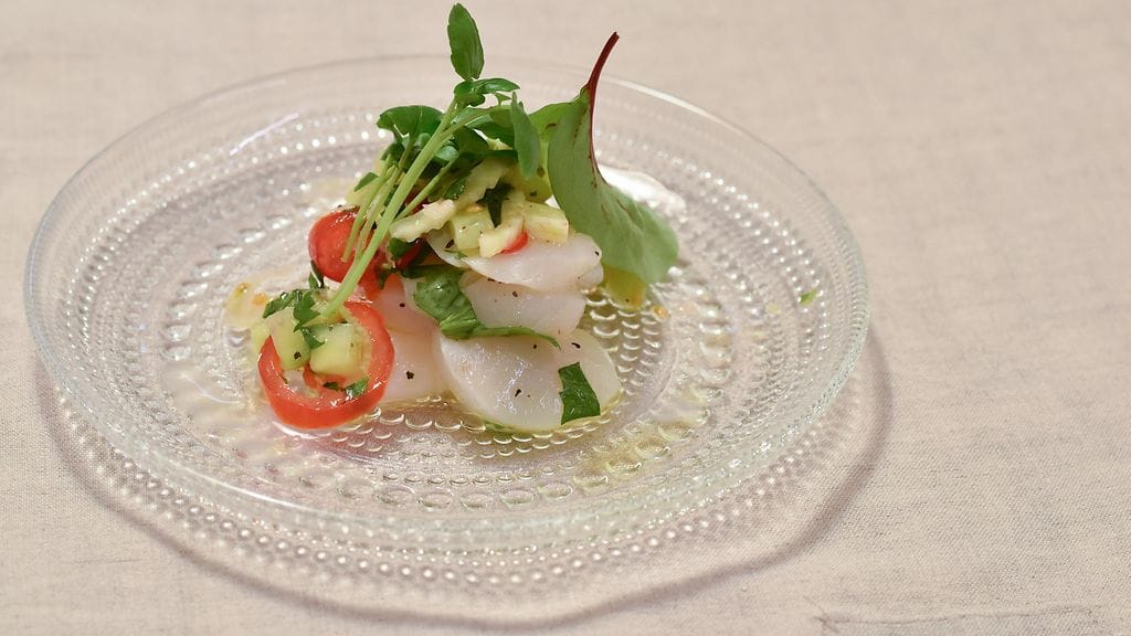 Puolita kampasimpukat paksuudeltaan puoliksi ja levitä ne isolle lautaselle. Kaada kastike kampasimpukoiden päälle ja laita jääkaappiin tekeytymään noin 30 minuutiksi. Tämän jälkeen tarkista maku.