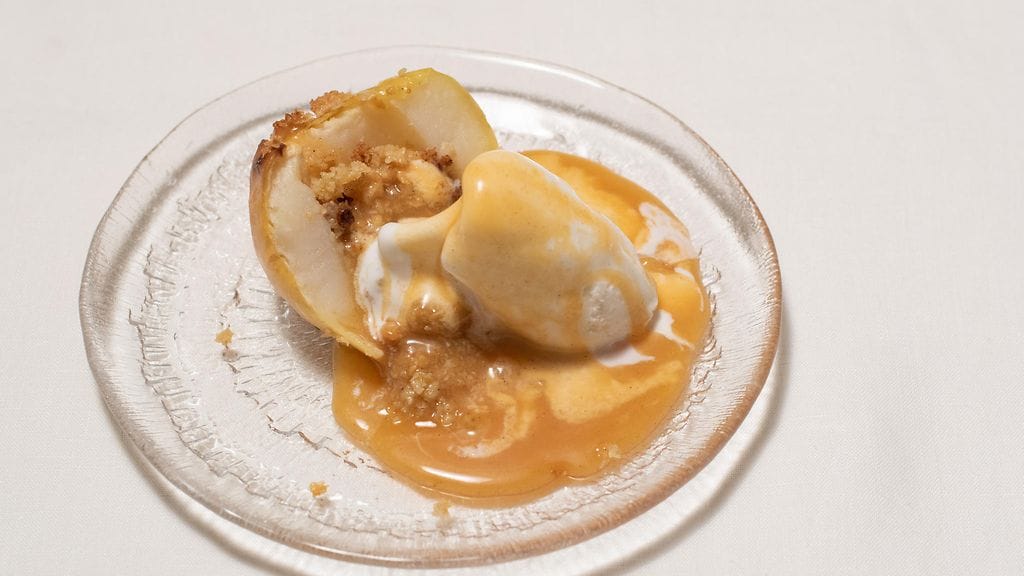 Kasaa annos. Kasaa omana lautaselle ja pyöräytä kuumalla isolla lusikalla jäätelöstä pallo omenan päälle. Kaada kuuma kinuski vielä jäätelön päälle. Tarjoile.