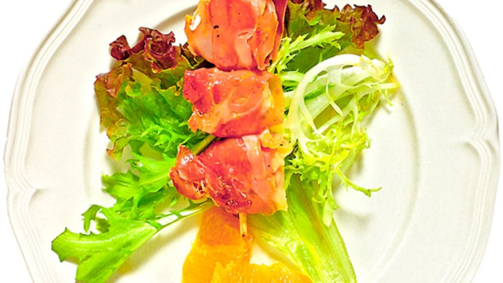 3. Kuumenna uuni 275 asteeseen. Laita neljälle lautaselle salaatinlehtiä ja appelsiinifileitä. Nosta katkaravut marinadista ja kuivaa ne. Säästä marinadi. Kiedo kinkkuviipaleet katkarapujen ympärille ja pujota vartaille. Laita vartaat vierekkäin uuninkestävään vuokaan ja kaada marinadi niiden päälle. Laita uuniin 10 minuutiksi tai kunnes kinkku alkaa rapeutua ja katkaravut ovat kokonaan lämmenneet. Laita vartaat lautasille ja tarjoile heti.