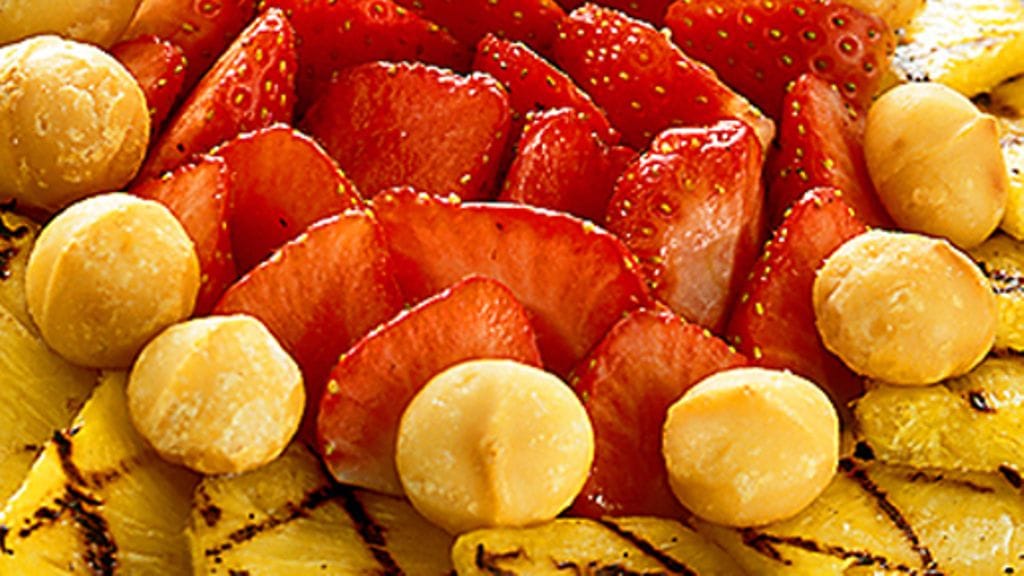 3. Kaada taikina voideltuun ja jauhotettuun vuokaan. Paista uunin keskitasolla n. 40 minuuttia. Anna kakun jäähtyä hieman, kumoa ja jäähdytä täysin. Levitä päälle tuorejuustoa, koristele hedelmillä ja pähkinöillä.