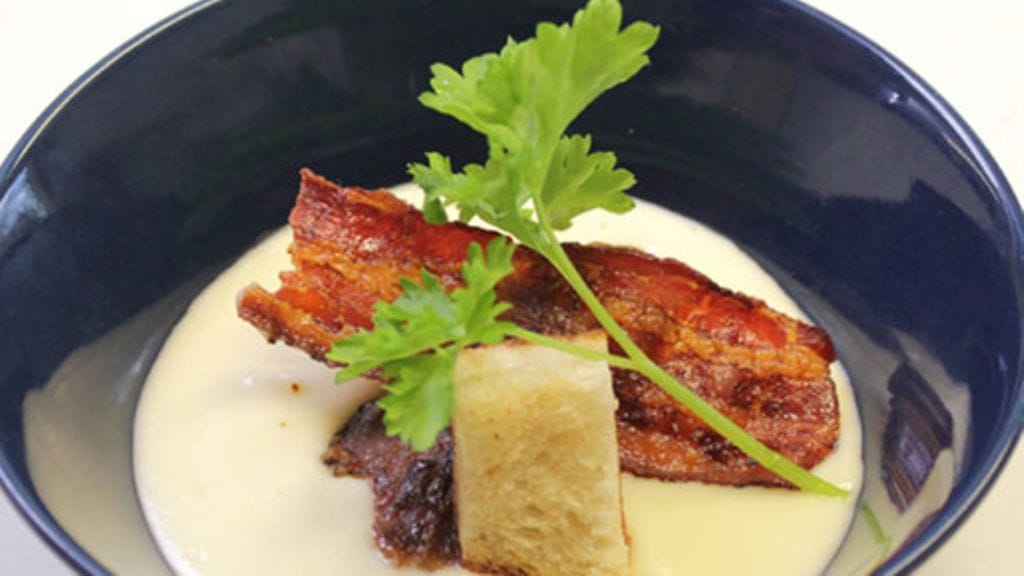 5. Siirrä kattilan sisältö tehosekoittimeen ja aja tehosekoittimella kauniin tasaiseksi keitoksi. Voit käyttää myös sauvasekoitinta mutta tehosekoittimella saat keitosta kuohkeampaa. Lisää suola ja pippuri, maista. Jos keittoa on liian sakeaa, ohenna vedellä ja kiehauta kattilassa uudelleen kuumaksi.