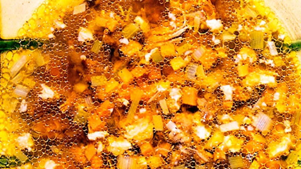 1. Kuullota currya voissa padassa. Sekoita joukkoon karkeasti raastettu omena. Ripota päälle jauho, sekoita ja kaada päälle kanaliemi, kiehauta sekoittaen.