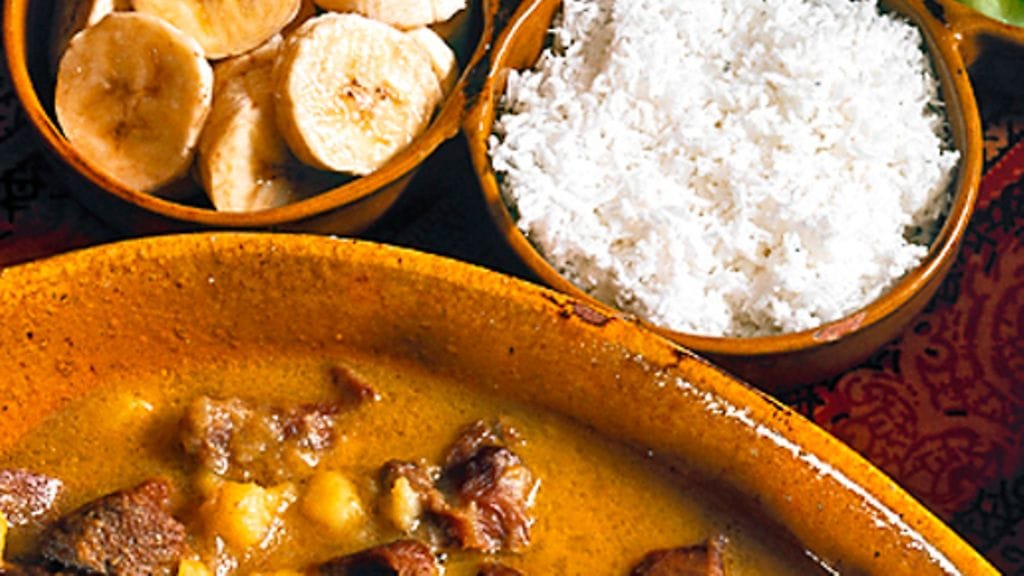 3. Mausta kookosmaidolla, kun pata on kypsää. Tarjoile riisin ja lisäkkeiden kanssa, esimerkiksi banaania, maapähkinöitä, kookosta, kurkkua, paprikaa ja rusinoita.